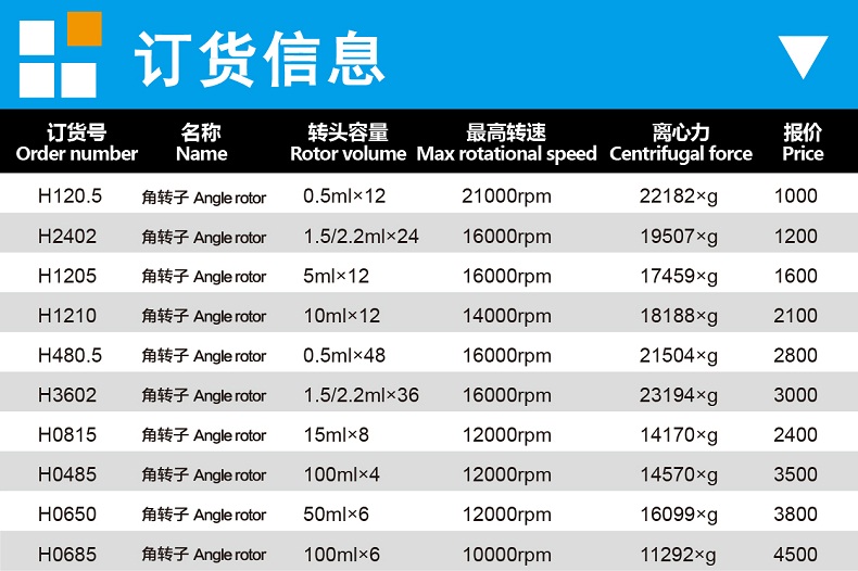 | H3602 | 角轉(zhuǎn)子 | 1.5/2.2ml*36 | 16000rpm | 17459g |