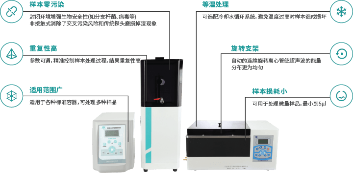非接觸式超聲波粉碎機也叫杯式超聲破碎儀,可在密閉容器、無菌、可超微量條件下進(jìn)行破碎。相比傳統(tǒng)的探頭超聲波細(xì)胞粉碎機,該儀器具有一次可同時檢測多個樣品、實驗效率高、無需頻繁操作探頭、避免樣本交叉污染等優(yōu)勢。且該儀器可選配低溫恒溫裝置,便于樣品在4-10℃環(huán)境內(nèi)工作,使能量分布均勻,超聲作用完全。逐漸成為ChIP(染色質(zhì)免疫共沉淀)和DNA剪切研究平臺不可缺少的標(biāo)準(zhǔn)化工具。