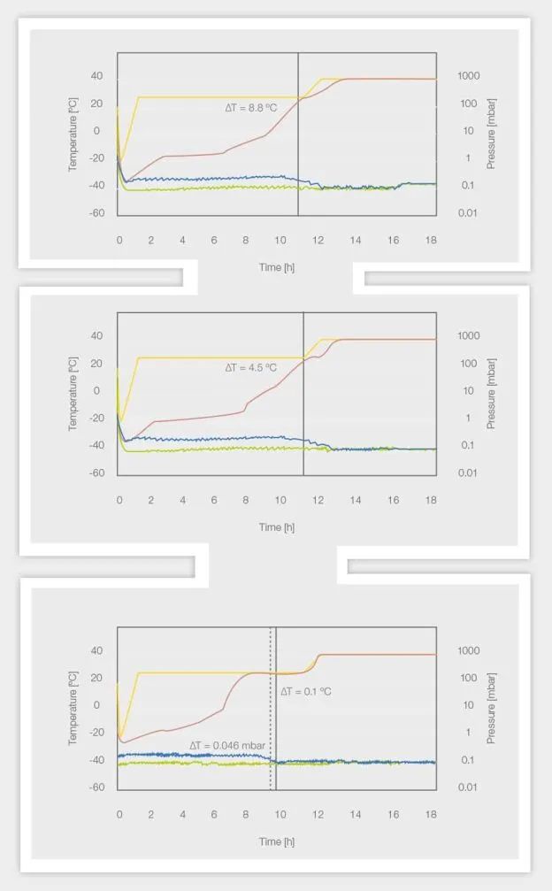 上圖所示為壓差為 0.05 mbar 的結果,中間圖為 0.03 mbar,底圖為 0.025 mbar 作為終點標準。在達到終點標準之前,壓差至少保持 60 分鐘。隔板溫度用黃線表示,樣品溫度用紅線表示,干燥箱壓力用綠線表示,皮拉尼壓力計在初級干燥(白色陰影)和二級干燥(灰色陰影)上用藍線表示。同時顯示達到壓力(黑線)和溫度終點標準(黑色虛線)的時間,以及該點相應的溫度和壓力差。