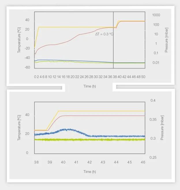 另,下圖中的頂部線顯示 37 小時后到達終點。此時,溫度曲線和壓力曲線在循環(huán)轉換為二級干燥之前同時合并。