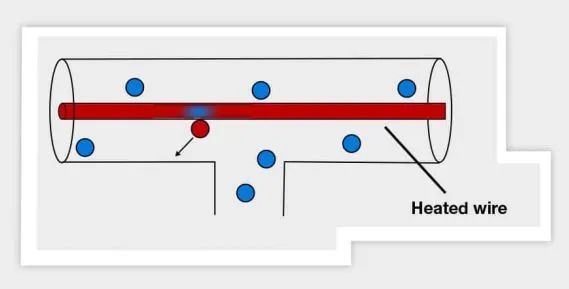 該技術使用兩種不同的壓力計,一個皮拉尼傳感器和一個電容壓力計。皮拉尼傳感器的工作原理是氣體的熱導率隨壓力變化。壓力計用一根細導線懸掛在氣體中,用電流加熱來測量壓力。在高壓下,由于周圍氣體分子與金屬絲的高碰撞率,金屬絲將熱能損失給氣體。這一原理如下圖所示。