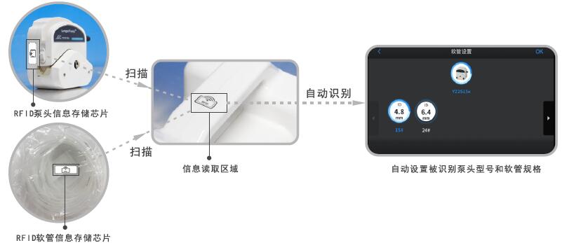 新推出的三款智能蠕動(dòng)泵具有“泵頭和軟管型號(hào)自動(dòng)識(shí)別”功能。通過RFID技術(shù),泵可自動(dòng)讀取泵頭型號(hào)和軟管規(guī)格信息,并在運(yùn)行方案中設(shè)置相應(yīng)參數(shù)。不僅幫助客戶簡(jiǎn)化操作過程,提高工作效率,而且能夠有效保證泵頭與軟管參數(shù)的正確性,為實(shí)現(xiàn)高精度的流體傳輸提供有力支持。